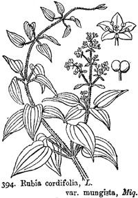 山野路傍等に自生する多年生草本にして莖は方形、中空にして蔓性なり、葉は長卵形にして先端尖り節毎に4個づゝ輪生し莖と共に刺毛を密生す。初秋の頃莖梢上に白色を帶ぺる淡綠色にして5裂せる合瓣花を開き花後黑色の漿質果を着生す、此植物の根は細條多く簇り出で其色は黄色なり。≪大植物図鑑の続きを読む≫